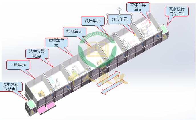 系統(tǒng)由9個工作站----流水線轉(zhuǎn)向站點1、上料單元、法蘭安裝站點、鎖螺絲單元、液壓單元、視覺檢測單元、分揀單元、立體倉庫單元、流水線轉(zhuǎn)向站點2和一些輔助單元—滾筒皮帶轉(zhuǎn)角單元、空直線單元組成。