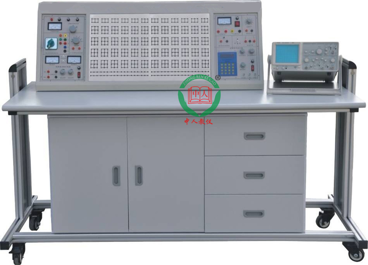 (一)實驗桌:學生實驗桌12張,一桌二座,實驗桌外形尺寸為160×70×80cm。桌子中央配置九孔電路插板,電路板進口由ABS注塑而成,背面裝有壓鑄而成九孔成一組的銅片,表面布有九孔成一組相互聯通的插孔,元件盒在其上任意拼插成實驗電路。創新元件盒盒體透明直觀,內裝電阻、電容、電感、二極管、三極管、場效應管、可控硅等元件來完成原理實驗。內裝元件一目了然,盒蓋印有永不褪色元件符號,線條清晰美觀。盒體與盒蓋采用較科學的壓卡式結構,維修、拆裝方便。繼電部分訓練元器件已裝在特制的元件盒上,實訓時插在九孔電路板上即可連線實驗,方便,靈活。電子技能實訓項目由二十幾套實訓電路板和相應元器件來完成。每張操作桌配有一粒膠皮板,保護通用電路板和桌面(如需要在桌上放置電動機、焊接等) 桌子下部是元器件儲存柜,放置實驗元件、器材、工具等。