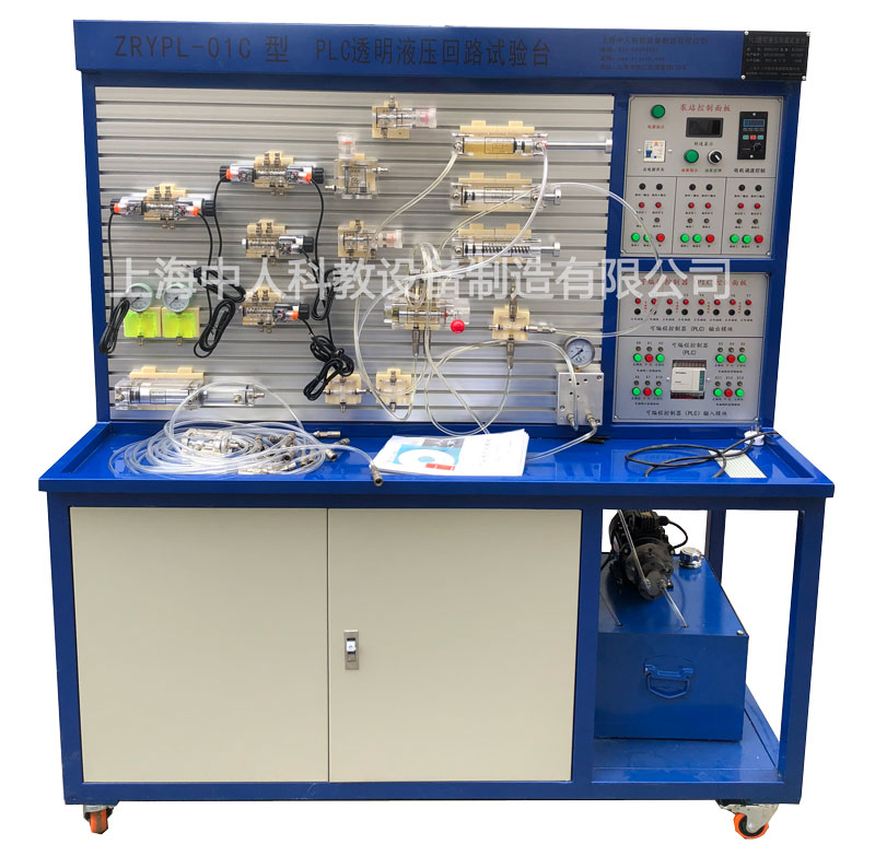 1、透明液壓傳動與PLC實訓裝置,透明液壓傳動實驗臺主要由實訓桌、實訓臺、液壓元件和電器控制器件、可編程控制器(PLC)等組件組成。