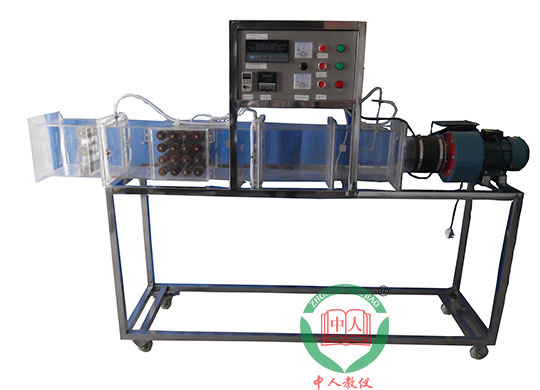 多翼式低噪音風機,自動調(diào)節(jié)風門,組合式有機玻璃風洞,翅片加熱管,加熱由固體調(diào)壓模塊配電位器調(diào)節(jié)加熱功率,數(shù)顯電流表、電壓表,翅片管簇順排和叉排組合,溫度傳感器,畢托管配差壓傳感器測量風量,16路萬能信號輸入巡檢儀顯示溫度、阻力、流量,不銹鋼支架。