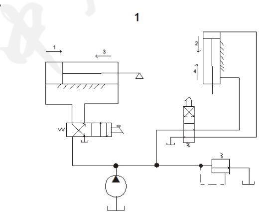 動作開始時,扳動換向閥,使其右位接入系統,水平液壓缸活塞向右移動(動作1),到達終點時撞塊把二位四通行程壓下,垂直液壓缸活塞向下運動(動作2),當手動換向閥換向以后,水平液壓缸向左退回(動作3),當撞塊離開行程閥的滾輪時,行程閥復位(圖示位置)垂直液壓缸活塞上升(動作4),實現了按1--2--3--4的順序動作。調節撞塊的位置,就可以控制動作2繼動作1之后開始的時間。
