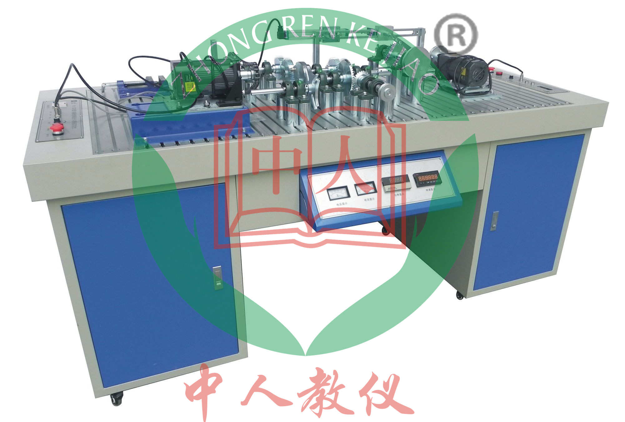 (1)多功能機械系統創新組合搭接綜合實訓裝置,機械原理實訓臺采用鐵質雙層亞光密紋噴塑結構,臺面為帶“T”形槽的鋁合金型材操作面板,設有四個柜子(雙層結構),便于存放實訓工具和資料