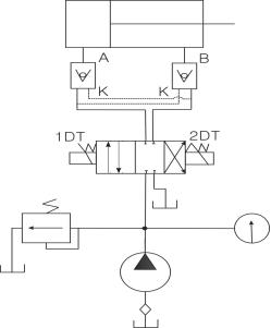 在圖示位置時,液壓泵輸出油液通過換向閥回油箱,系統(tǒng)無壓力,液控單向閥A、B關(guān)閉,液壓缸兩腔均不能回油,于是,活塞被雙向鎖緊。要使活塞向右運(yùn)動,則需換向閥1DT通,左位接入系統(tǒng),壓力油經(jīng)單向閥A進(jìn)行液壓缸左腔,同時也進(jìn)入液控單向閥B的控制油口K,打開閥B,液壓缸右腔回油可經(jīng)閥B及換向閥回油箱,活塞便向右運(yùn)動。反之向左,液控單向閥的密封性好,所以鎖緊效果較好。