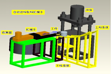 沖床取件送料機械手,由上料系統,下料系統,收集,電控系統等部分組成。工作過程:上料系統將一個工件選出,機械手夾取工件送入沖床指定位置,放開工件并退回;沖床沖壓工件;機械手夾取工件送到下料系統收集;機械手復位。