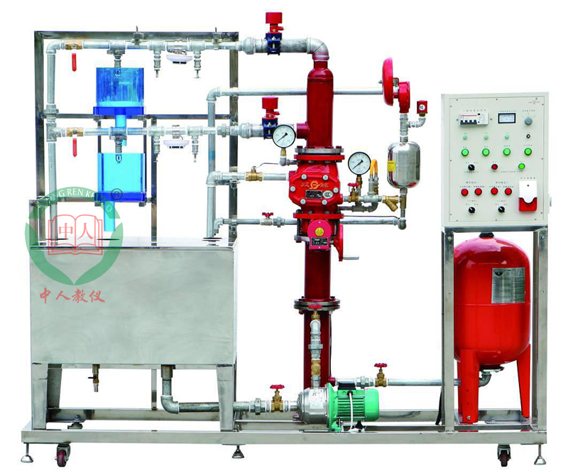 模型框架和水箱等主要部件全部使用不銹鋼器件,保證不生銹、不易老化,可以模擬兩層大樓噴淋滅火系統;模型系統主要由噴淋水泵、氣壓罐、濕式報警閥、水力警鈴、延時器、壓力開關、水流指示器、封閉式噴頭、試驗閥、火災探測器、火災報警器等典型噴水滅火設備構成,能生動模擬大樓內水滅火系統的典型結構。