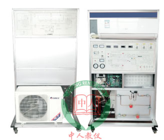 3.裝置直觀展示了變頻空調的系統結構和工作原理,便于教學演示講解及學生對課本知識的理解掌握。配置的交流電壓表、交流電流表、溫度表、真空壓力表以及相應的信號指示燈,使整個變頻空調系統的實時工作狀態一目了然;主面板中間印有電氣控制系統原理圖,并設有相應測試點;屏背面可觀察到整個制冷系統結構原理以及主要部件的實際物體,相應部件均有名稱標識;并設有視液鏡,可觀察制冷劑狀態