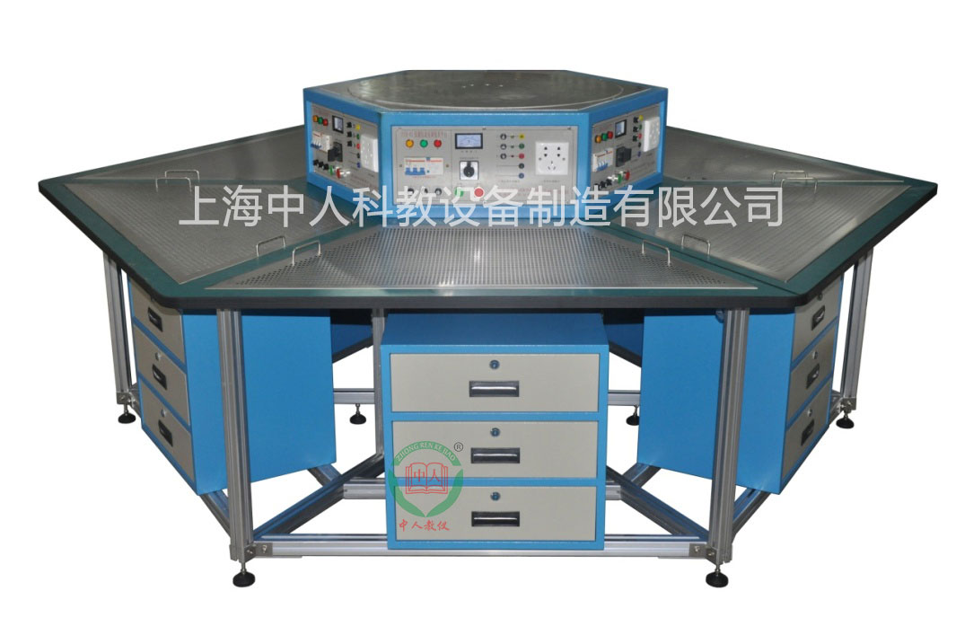 整個控制屏由六工位組成,每個工位均設有啟動、停止按鈕控制電源的輸出,并設有急停按鈕,電源輸出有短路保護。同時設有450V指針式交流電壓表一只,通過波段開關切換指示電源輸入的三相線電壓。
