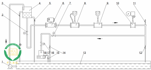 1. 循環水泵; 2. 總閥; 3. 溢流閥; 4. 高位水箱; 5. 12. 14.15. 排液閥; 6. 電磁流量計;7. 比例調節閥; 8. 渦街流量計; 9. 渦輪流量計; 10. 孔板流量計; 11. 放氣閥; 13. 水槽;16. 電磁閥; 17. 電子秤; 18. 稱量筒。