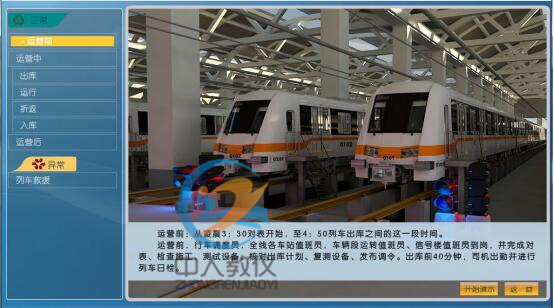 6.日常運營業(yè)務(wù)流程教學(xué)功能:按照軌道交通的日常行車組織的業(yè)務(wù)流程,通過構(gòu)建虛擬的控制中心、車站(集中站、非集中站)、停車場、列車及相應(yīng)的行車人員,進行這些行車崗位在日常運營過程中的運營前準(zhǔn)備作業(yè)、列車出庫、列車運行、列車折返、列車回庫、運營后作業(yè)等過程中的業(yè)務(wù)流程及具體工作的教學(xué)。