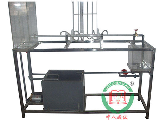 有機玻璃實驗水箱、局部阻力管、測壓管、水泵、蓄水箱、計量水箱、刻度標尺、秒表、玻璃溫度計、自循環裝置、閥門、不銹鋼框架。