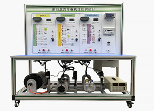 新能源電機性能試驗臺由實訓臺架、DC電源、三種新能源汽車常用電機(永磁同步、交流異步、輪轂電機)、三種新能源汽車配套電機控制器、加速踏板、檔位器、數顯電壓電流表、轉速表、扭矩表、功率表等模塊組成。