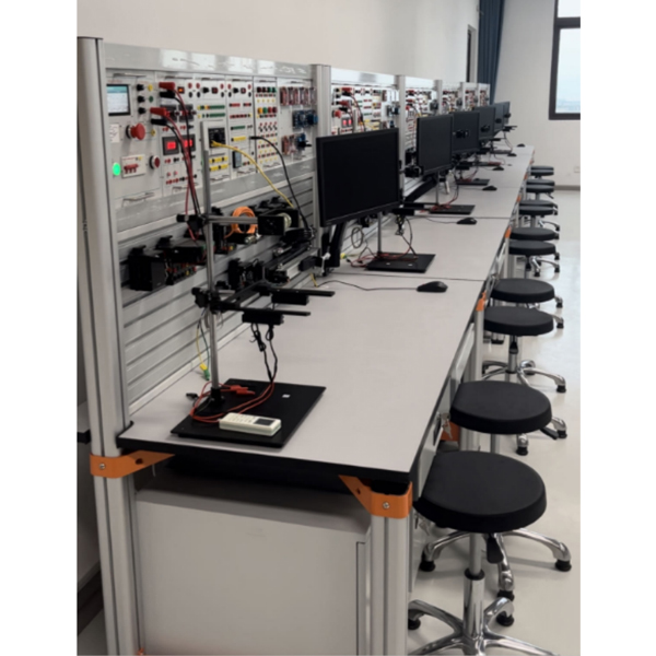 尺寸1600*800*1650mm;單面型鋁型材屏;鋁型材框架;剎車腳輪;臺架設有一抽一鍵,實驗桌主體結構全部采用高性能表面氧化的鋁型材及一次成型鋁壓鑄框架連接構件,連接構件采用壓鑄成型工藝(非焊接工藝),經機加工、拋丸、噴砂,表面靜電噴涂工藝,安裝方便、快捷,用戶可自行DIY組裝。桌體立柱采用工業鋁型材成型工藝,表面氧化處理,截面尺寸:70×70mm,四面帶槽,槽寬約8mm,端部配套塑料堵頭。桌面采用25mmE1級三聚氰胺飾面板,桌面板下設支撐框架,承受力不少于300kg。配備儲存柜,存放實訓掛箱等,儲存柜底部4只高強度萬向可制動PU腳輪,方便移動。實訓裝置整體簡約不簡單,高端大氣,符合現代化產品審美和發展趨勢。