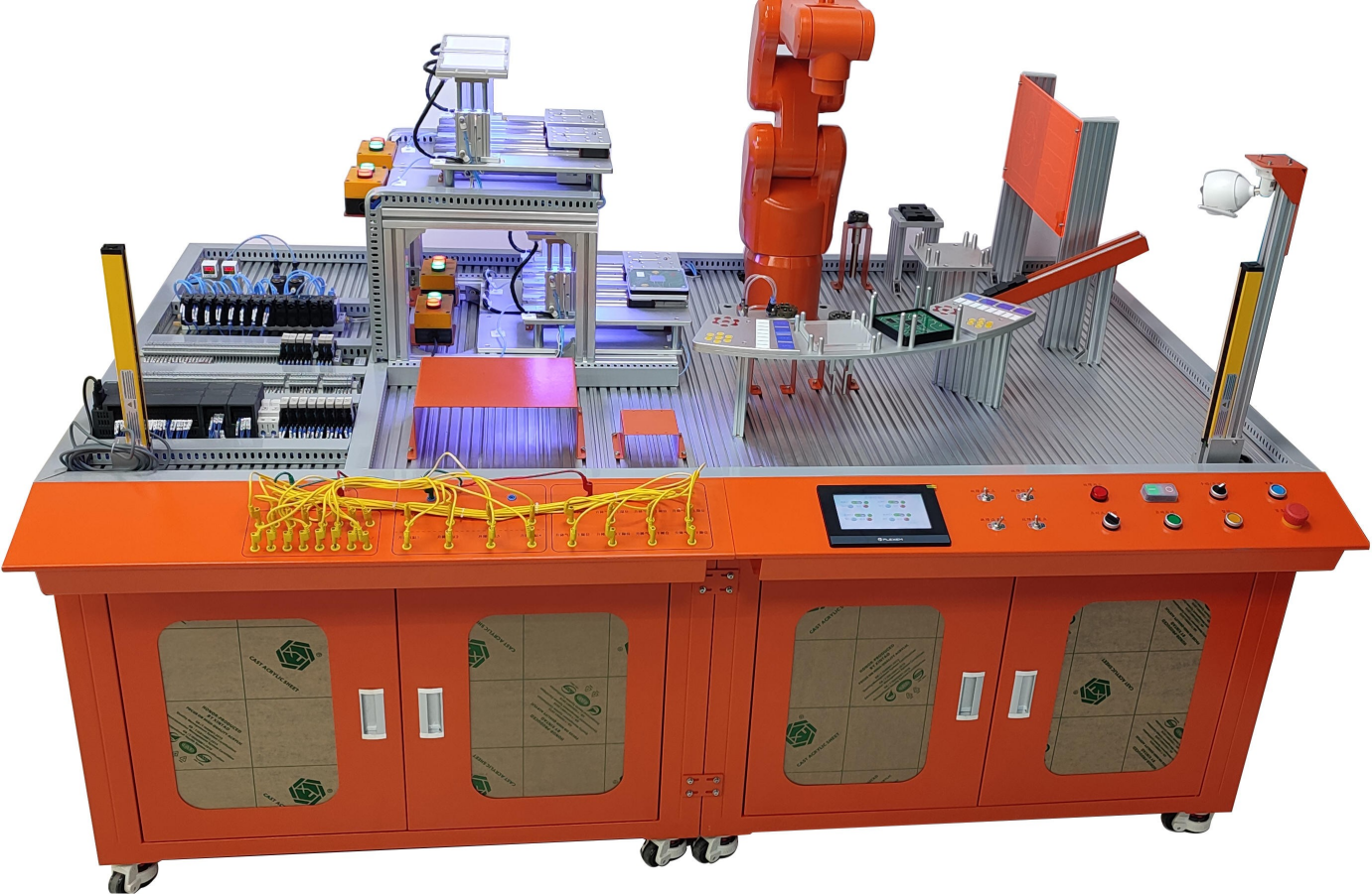 為方便教學和考試使用,在平臺上布置了智能攝像頭,通過互聯網技術可將設備的實時操作過程在大尺寸教學終端中進行展示,避免了集中式教學學生圍觀又無法切實看清教師操作過程的問題,使教師可以對學生的操作流程實時點評提高教學指導效果,同時對操作過程做到可追溯,為考試過程中爭議事件提供佐證材料,方便爭議復核;同時,在工作站操作正面,利用線性光柵作為安全保護措施,當操作人員進入危險區域時,工作站會蜂鳴報警,并停止工業機器人所有運動,以避免危險發生。