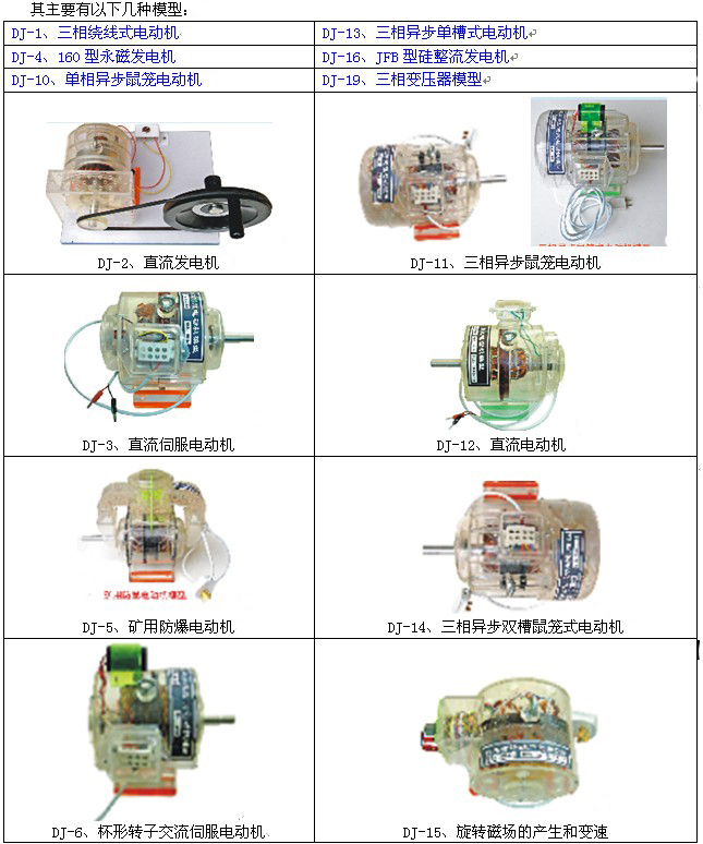 本系列透明電機與變壓器教學模型采用與實物相同外形尺寸,內部結構均按相應電機原理結構制作,外殼采用進口透明有機玻璃,采用模具一次成型,透明直觀,形象逼真,并能通電演示,真實反應電機的結構及工作原理,是各類院校電機工作原理及結構的講解及電機拆裝、電機檢修、電機維修及檢測實訓室理想的配套設備。