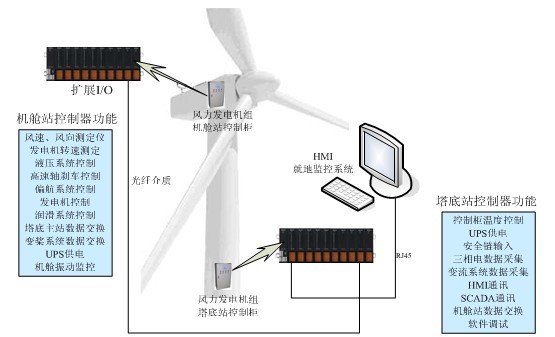主控系統用于連接風速風向傳感器、震動傳感器、位置傳感器、測量、安全鏈、監控系統等,控制風速方向、偏航、變槳等信息。