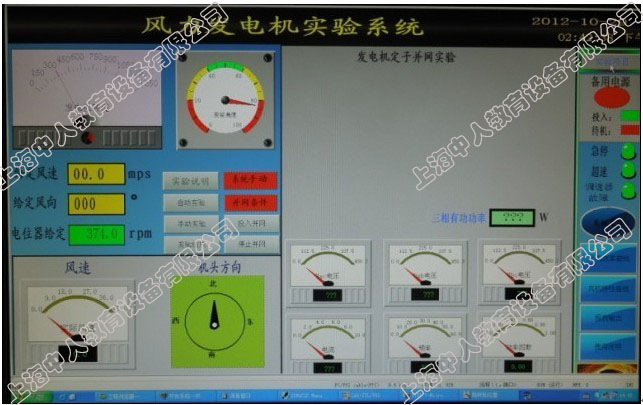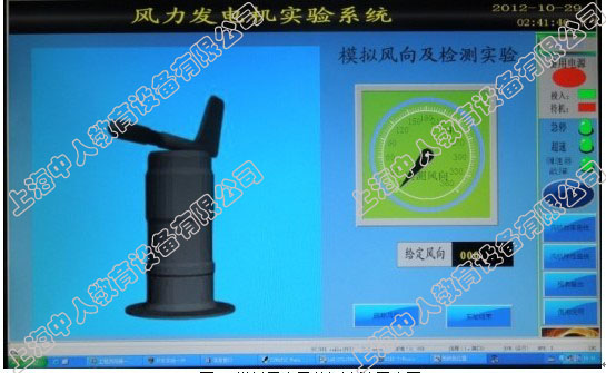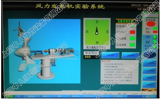 風力發電機整機模擬系統包括操作臺柜、PLC、按鈕、指示燈、測控儀表、風速風向發生儀、監控系統等,用于模擬風機內部各種控制信號。模擬測試系統與實際控制系統連接,來模擬風機運行的實際狀況。風力發電機內部模擬控制信號可通過PLC編程控制,用戶也可在現有硬件基礎上自行開發控制軟件,實現對各種自然風的模擬,完成對風力發電機控制算法的研究。