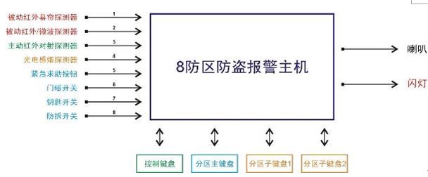 用戶與報警系統間的通訊界面。用戶可通過鍵盤發布指令;鍵盤則在用戶的整個操作過程中提供可視顯示和有聲提示。帶標有數字的防區指示燈,用于顯示各個防區的狀態 |