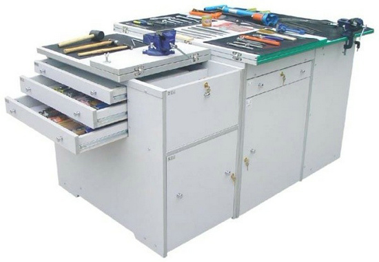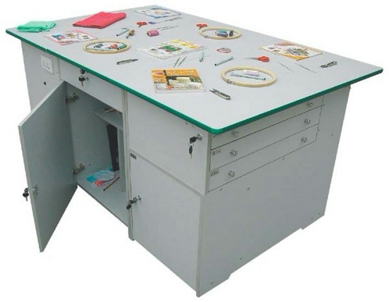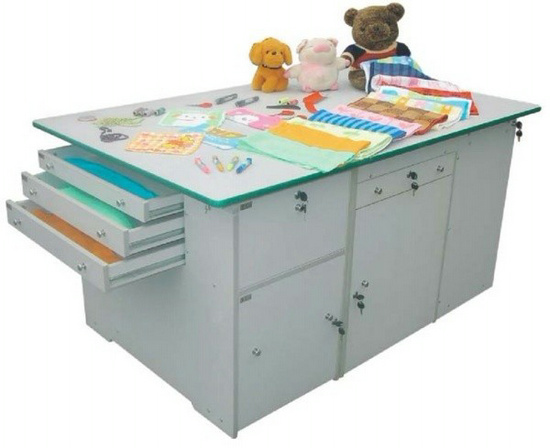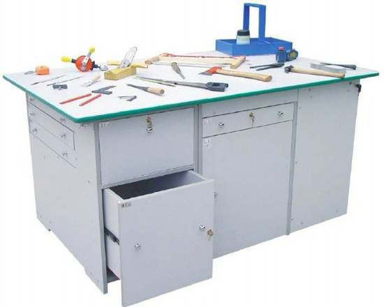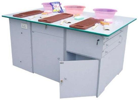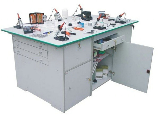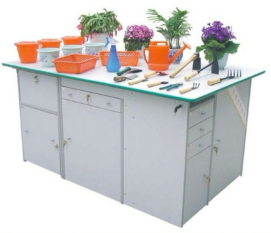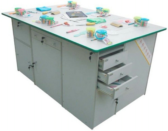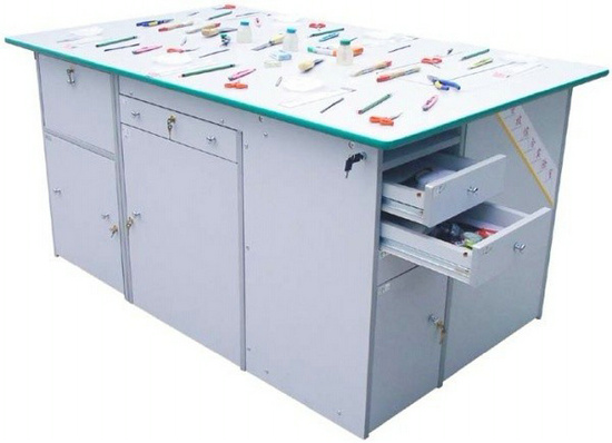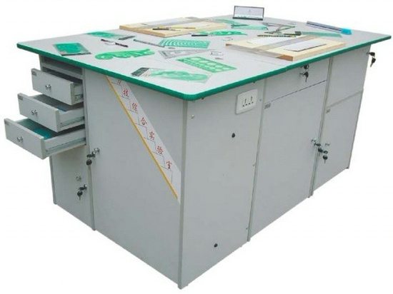 功能:桌體材料選用16mm厚優(yōu)質(zhì)雙貼面三聚氰胺板和30mm×30mm角鋼組成,桌體板截面選用優(yōu)質(zhì)PVC封邊經(jīng)全自動封邊機(jī)加溫180攝氏度膠封。桌面材料選用(A型)18mm厚優(yōu)質(zhì)雙貼面三聚氰胺板或(B型)25mm后成型防火貼面密度板,桌面板截面選用綠色T型PVC封邊槽封。桌體設(shè)計(jì)由三獨(dú)立單元組合在一起,例如金工、木工、洗滌為A獨(dú)立單元,烹飪、電工與電子為B獨(dú)立單元,縫紉與裁剪、手工工藝為C獨(dú)立單元。如果A獨(dú)立單元或B獨(dú)立單元單獨(dú)操作時,桌面可翻轉(zhuǎn)自如,而且各獨(dú)立單元的配備都儲放在各自獨(dú)立單元桌體里面。